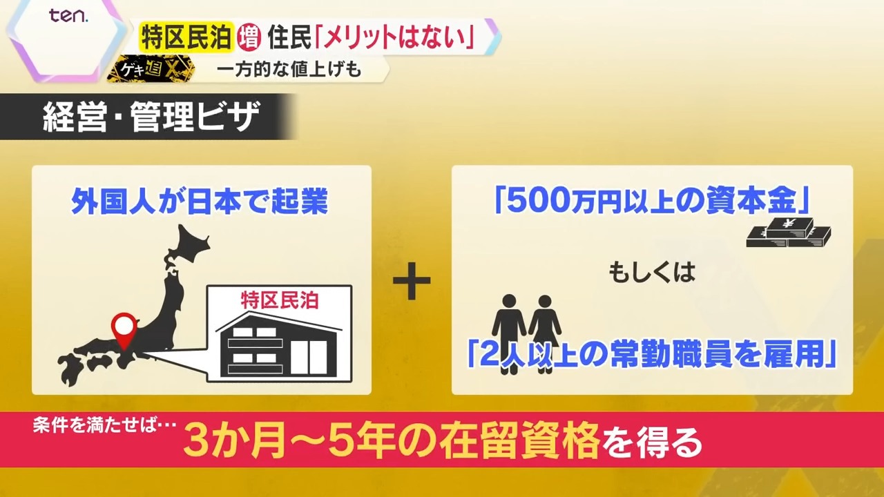 外国人が民泊を経営する場合、日本への在留資格となる『経営・管理ビザ』を取得でき、一定の条件を満たせば、3か月~5年の間、日本に滞在することができます。このビザ目的に民泊を経営する外国人も多くいるとみられ、松村教授の調査では、大阪市内の特区民泊の4割以上を中国人・中国系法人が運営しているということです。