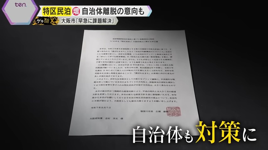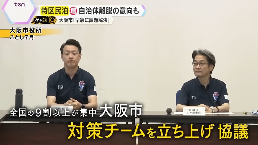 全国の9割以上が集中する大阪市も『対策チーム』を立ち上げ、今後の対応を協議しています。大阪市・横山英幸市長は、「騒音やゴミ出しも含め、地元住民とのトラブルが指摘されている。早急に課題の解決に向けて進めたい」としています。