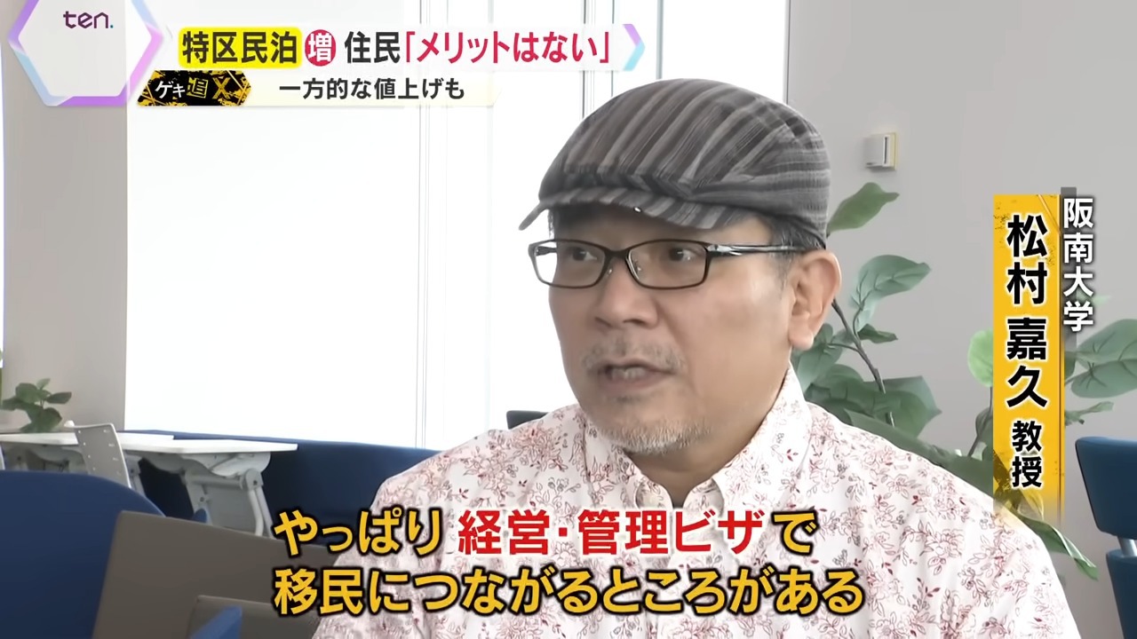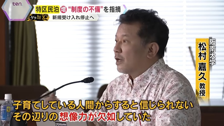 松村教授は、大阪市議の勉強会でも、「最初から主張しているが、制度設計するときに留意すべきだった点は、民泊は住宅なので、居住環境とすみ分ける立地制限は絶対に必要。家の隣に毎日入れ替わり立ち代わり外国人が入ってくるのは、子育てしている人間からすると信じられない。その辺りの想像力が欠如していた」と主張していました。