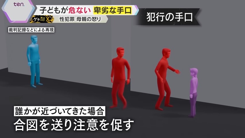 裁判記録などによると、「カマキリ探ししよ」などと言って女の子に近づいた男2人は、1人が女の子と会話し、もう1人は少し離れた場所で周囲を見張るなど、役割を分担。誰かが近づいてきた場合、地面を蹴ったり肩を叩いたりして合図を送り、互いに注意を促していました。