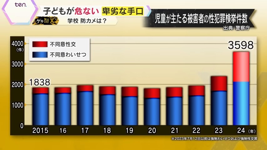 子どもが被害者の性犯罪の検挙件数は、2023年の法改正で適用対象が広がったこともあって増加し、2024年は3598件にのぼりました。その中で目立つのは、教員による性犯罪です。2023年度、処分を受けた教員は過去最多になりました。