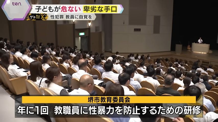大阪・堺市では年に1度、公立学校の全ての教職員を対象に、性暴力を防止するための研修を行っています。相次ぐ事案を受けて、2025年は校長・教頭・教員のリーダーとして学校を運営する主幹教諭らいずれかの参加を求め、子どもとの正しい距離感などを教えました。