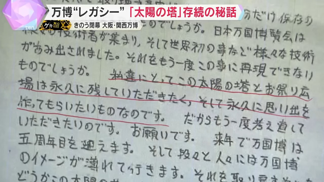 「『ダイナマイトで壊す』というのを見たある男の子が、手紙を書いたんです。『私達にとって、この太陽の塔とお祭り広場は永久に思い出を作ってもらいたいものなのです』と。お金を使って壊すなら、お金を使って残してくれませんか」