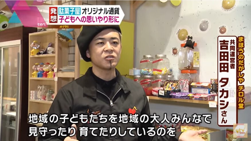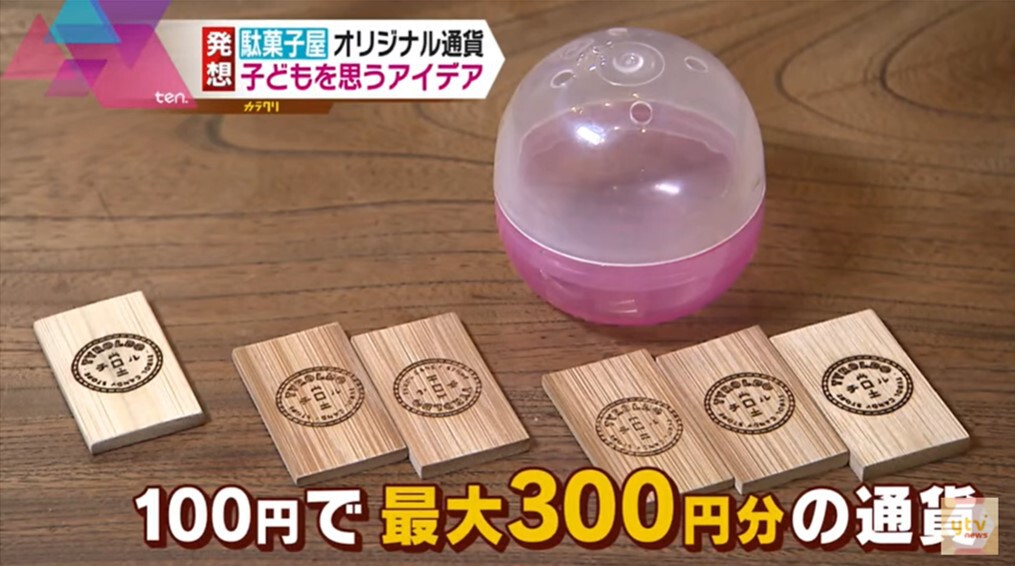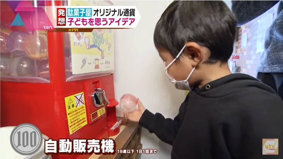 まず訪れたのは、奈良県生駒市にある「まほうのだがしやチロル堂」。お菓子を買いに来た子どもたちが、なにやら札のようなものを店員に渡しています。これは、店内通貨の「チロル」。1枚、“1チロル”という、子ども限定のオリジナル通貨だといいます。カプセルが入った自動販売機に100円を入れてレバーを回すと、チロルが出てくる仕組みです。