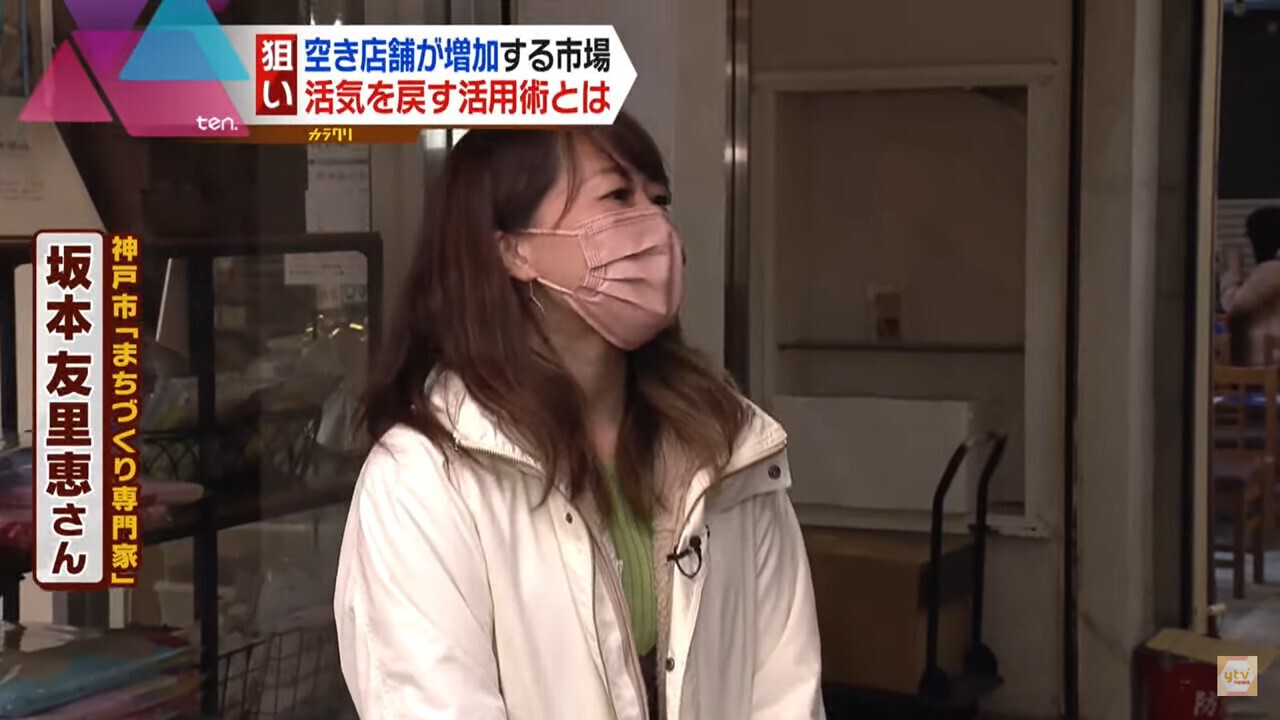 神戸市が指定する「まちづくり専門家」として活動している坂本 友里恵さんに市場を案内していただきます。精肉店や鮮魚店などが並ぶなか、シャッターが下りている所も目立ちます。市民の台所として親しまれてきましたが、現在営業している店は、最盛期の半分以下になってしまいました。