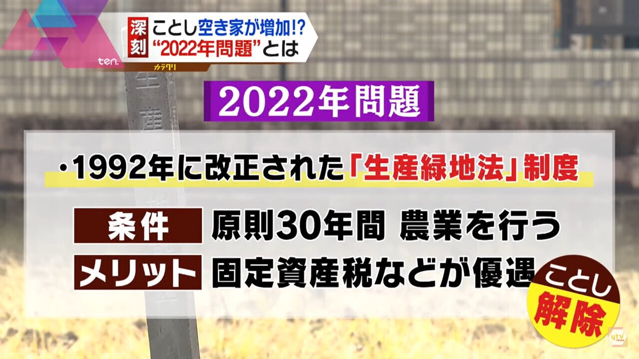 都会などにも農地を残すことを目的に「生産緑地法」が1992年に定められました。これは原則30年間、農業を行う事などを条件に、固定資産税などを優遇するものです。その30年の指定が解除されるのが2022年…。農地だった土地の制限がなくなるのです。