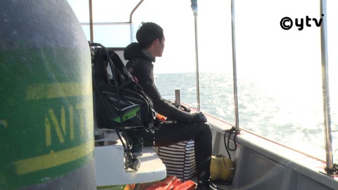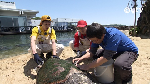 バックヤード見学を経て、体重100キロを超えるカメの甲羅磨き体験してあと、野生のウミガメを目指して人生初の気スキューバーダイビングにも挑戦!