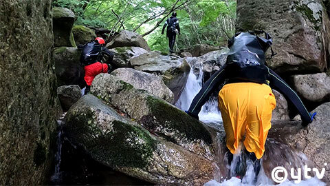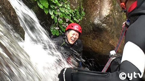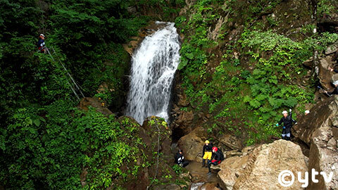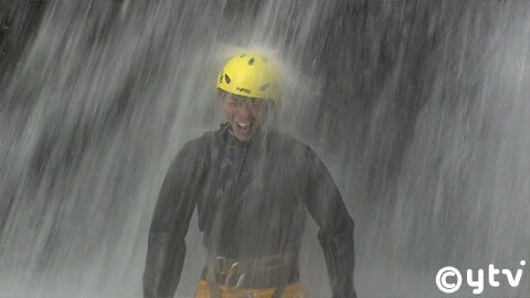 道中でトッピング用の高級食材をかけて勝負をしつつ、川を遡上するシャワークライミングに挑戦!