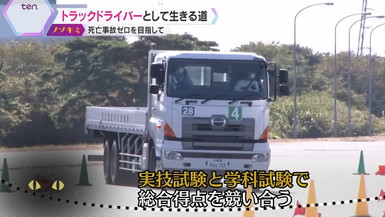 藤本さんが日本通運を選んだのは、「安全運転への教育と意識が高い」と感じたからです。日本通運は死亡事故ゼロを目指し、毎年開催されている『全国トラックドライバー・コンテスト』に力を入れています。コンテストでは実技試験と、トラックの構造法令に関する知識を問う学科試験で、総合得点を競い合います。参加者は、全国の運送会社のドライバーたちです。
