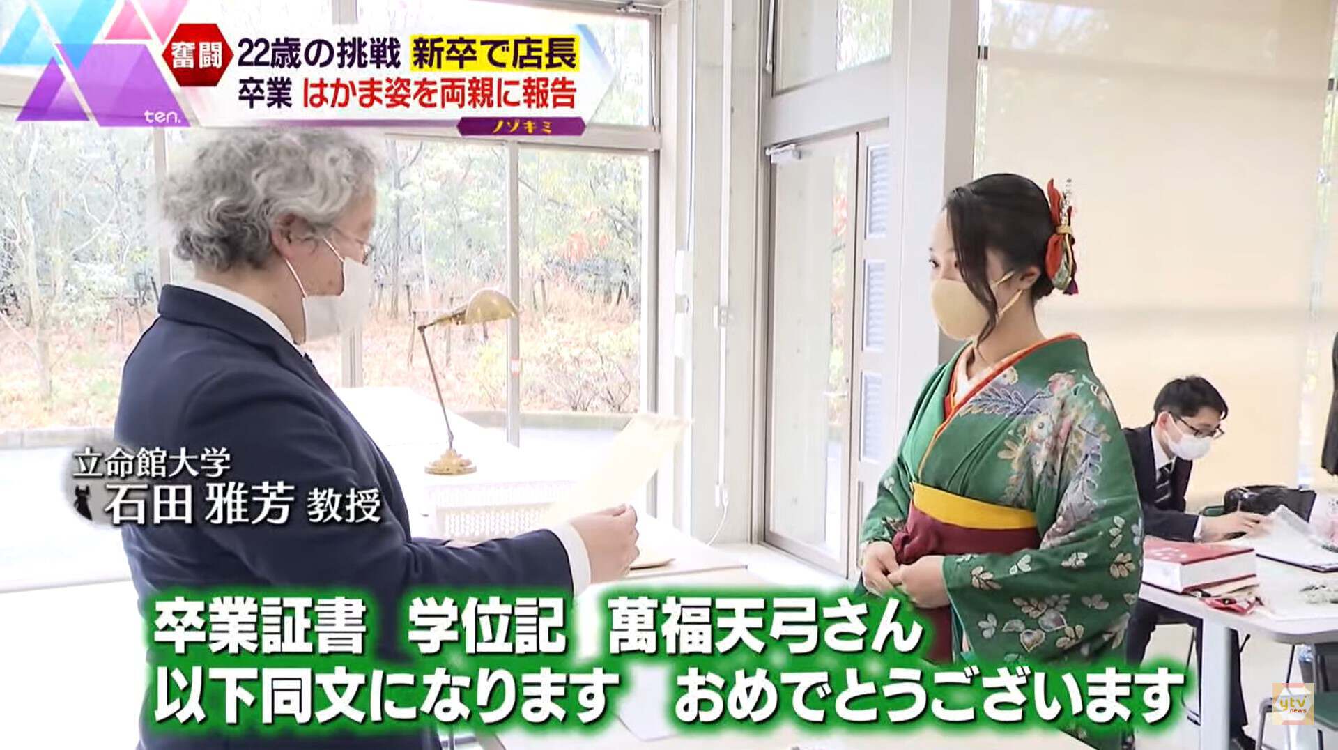 「卒業証書、学位記。萬福天弓さん。以下同文になります。おめでとうござます」