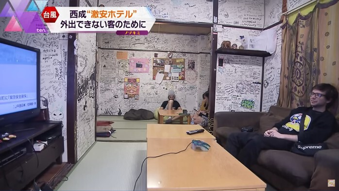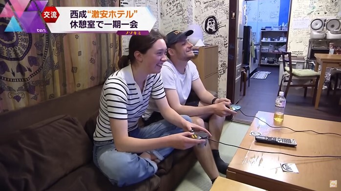 ある日の夕方。ホテルに帰ってきた客たちが向かった先は、共有の休憩室です。国も言語も違う旅行者たちがスマホの写真を見せ合ったり腕相撲をしたり、異文化交流を繰り広げていました。イギリスからやってきたというカップルは、テレビゲームを楽しんでいました。