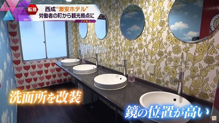 ホテル東洋の内装は、簡易宿泊所の名残は感じるものの、洗面所の鏡の位置が高かったり、大浴場を個室のシャワールームに変えたりと工夫してきました。