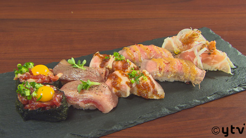 ⇒桜ユッケ軍艦、炙り和牛ロース、生ハムオニオン、自家製ローストビーフ、