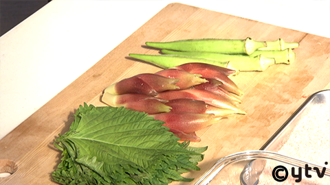 ①ミョウガ8本を横半分に切り、細切りにする。大葉10枚を千切り、オクラ5本は塩もみし輪切りにし、すべて器に入れる。