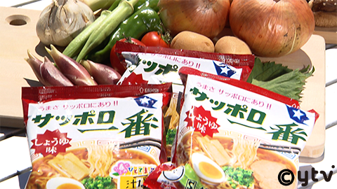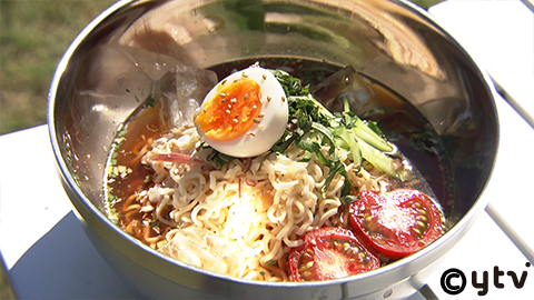 【食材】サッポロ一番(しょうゆ味)・きゅうり・プチトマト・ミョウガ・大葉・ゆでたまご・豚肉ロース