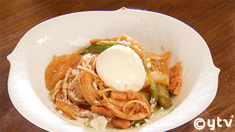 ⑥ ソースがちょうど絡まったら、皿に盛り中央に半熟卵をのせ、粉チーズをかけて完成!