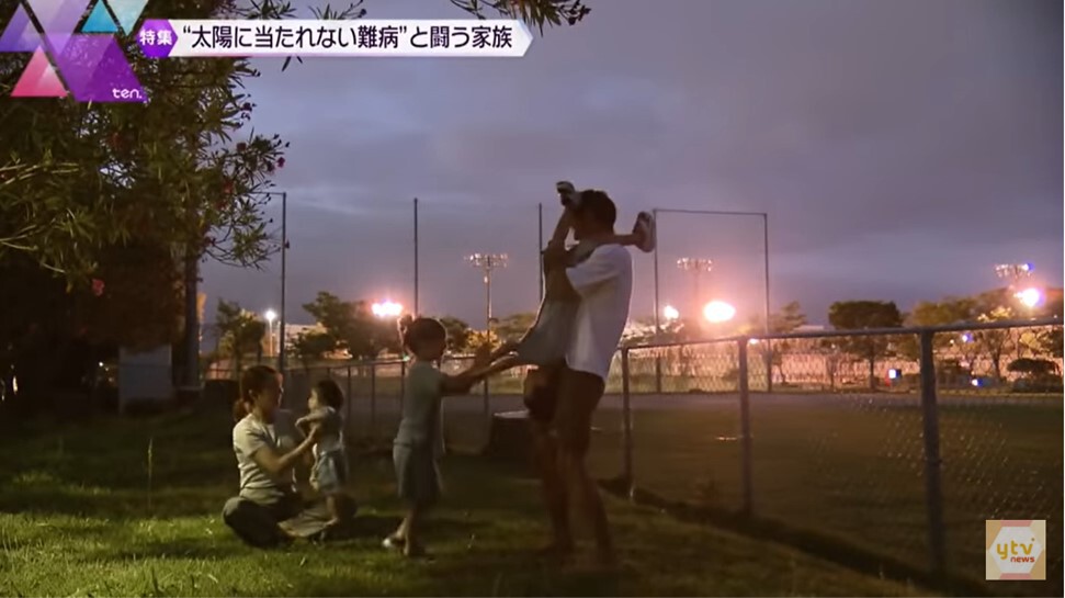 新貝海陽(しんがい・うみひ)くん、0歳8か月(当時)。生後2か月で、ある病気を患いました。紫外線を浴びると皮膚に火傷のような症状が出て、皮膚癌を発症する難病「色素性乾皮症(しきそせいかんぴしょう)」です。症例が少なく、国内の患者数は推定300人~600人ほど。現在、治療法は見つかっていません。そんな海陽くんの家族は太陽が沈んだ後に公園へ出かけます。