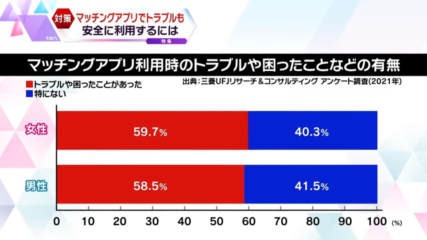 一方で、マッチングアプリの利用者増加に伴い、トラブルも増えています。メッセージ機能を悪用した性犯罪や恐喝、詐欺などの犯罪が相次いで発生していて、アンケート調査では、『アプリの使用中にトラブルや困ったことがあった』と答えた人の割合は、男女共に全体の6割にも及んでいます。