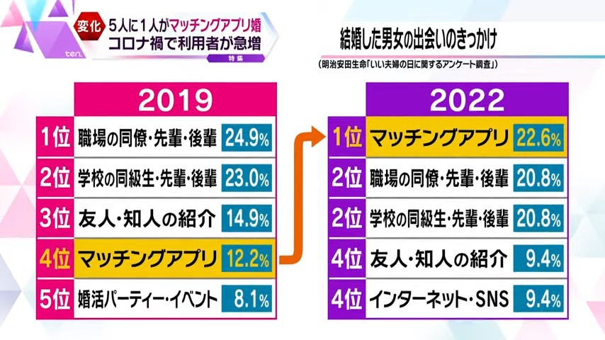 コロナ禍をきっかけに、マッチングアプリの利用者が急増しています。明治安田生命が行った調査では、2022年に結婚した人のうち5人に1人以上の22.6%が「マッチングアプリで出会った」と答えていて、2019年に1位・2位だった「職場」「学校」を上回り、1位になりました。