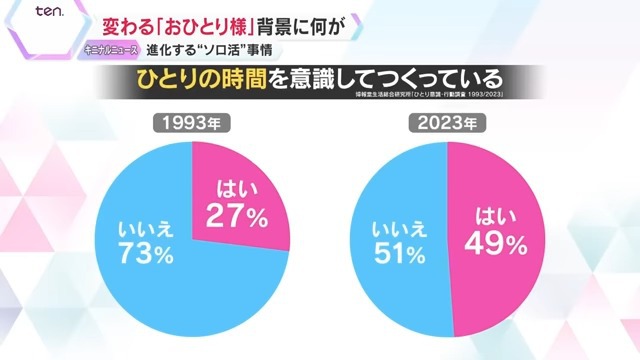 ひとりの時間を意識してつくっている人の割合は、1993年の27%から、2023年は約50%にまで増えました。