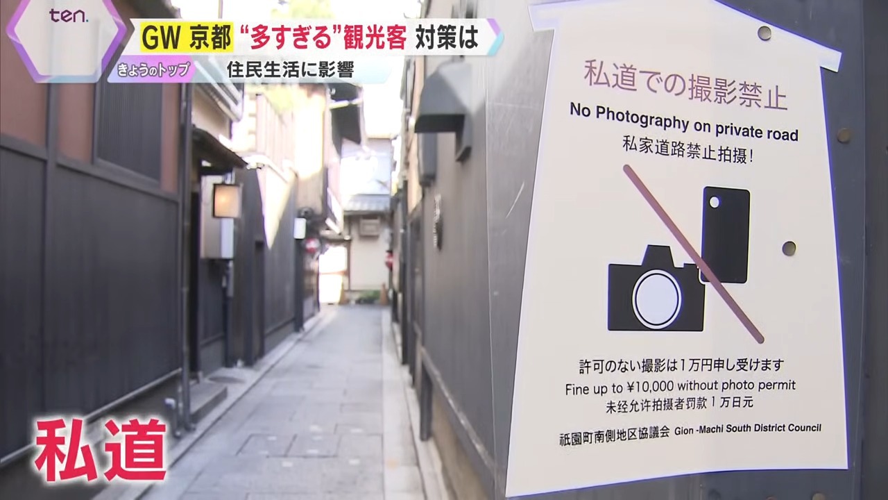 観光客と地域住民とのあつれきが顕著になっているのが、嵐山と並ぶ人気の観光地・祇園。店舗と民家が並ぶ『小袖小路』と呼ばれる100メートルほどの細い路地は、風情ある街並みで、あるネットドラマの舞台にもなりました。しかし、2024年5月29日には観光客の通行が禁止され、違反者には1万円の“罰金”を科すとした看板を設置しました。