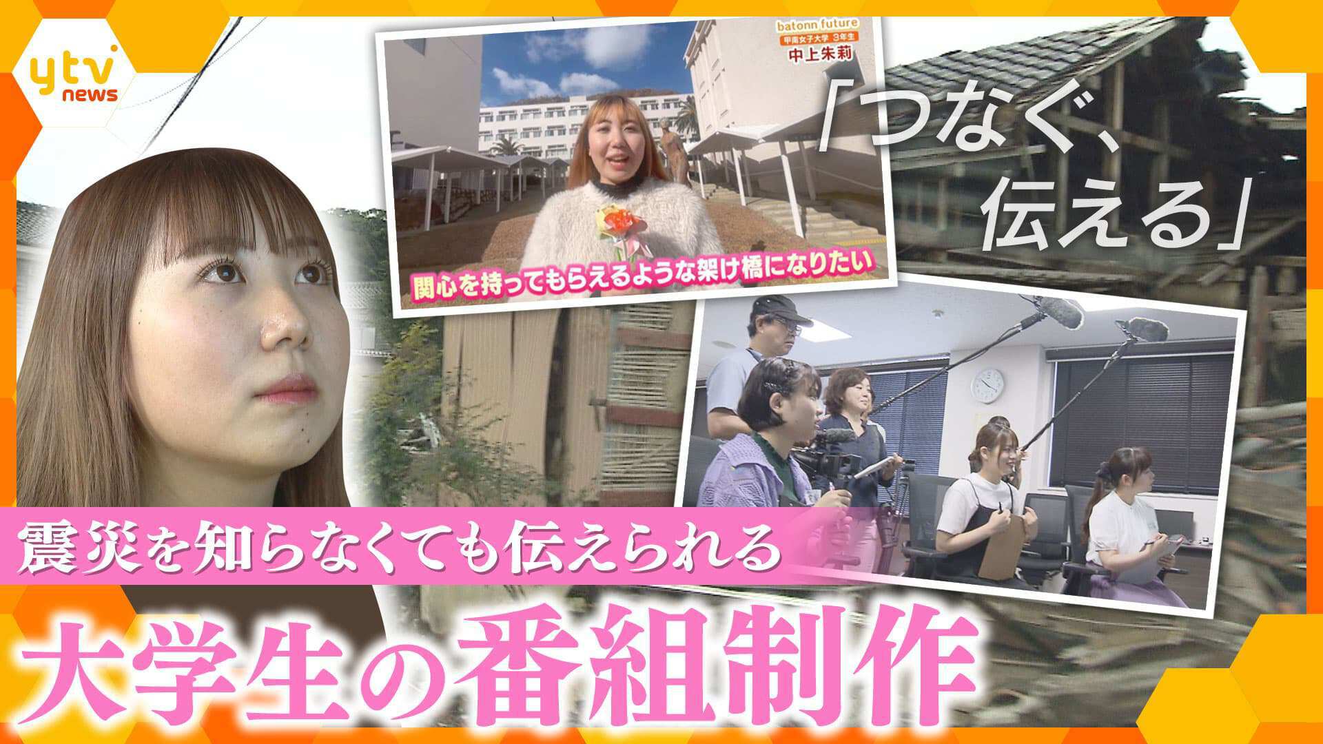 兵庫・芦屋市のケーブルテレビで1月16日から放送されている「つなぐ、伝える」は、甲南女子大学の学生が制作した震災番組です。メンバーのひとり、2年生の中上さんは、「震災」に触れることにハードルを感じていました。多くの人に話を聞き、学びを深めていく学生たち。こども2人を亡くした米津勝之さんから被災当時の話を聞くと、「知らない」自分に何ができるか不安が募ります。また、9月には能登へ。初めて見る被災地に言葉を失いました。震災と初めて向き合い、学生たちが気づいたこと、番組で伝えたいこととは。悩み考え抜いた半年間に密着しました。