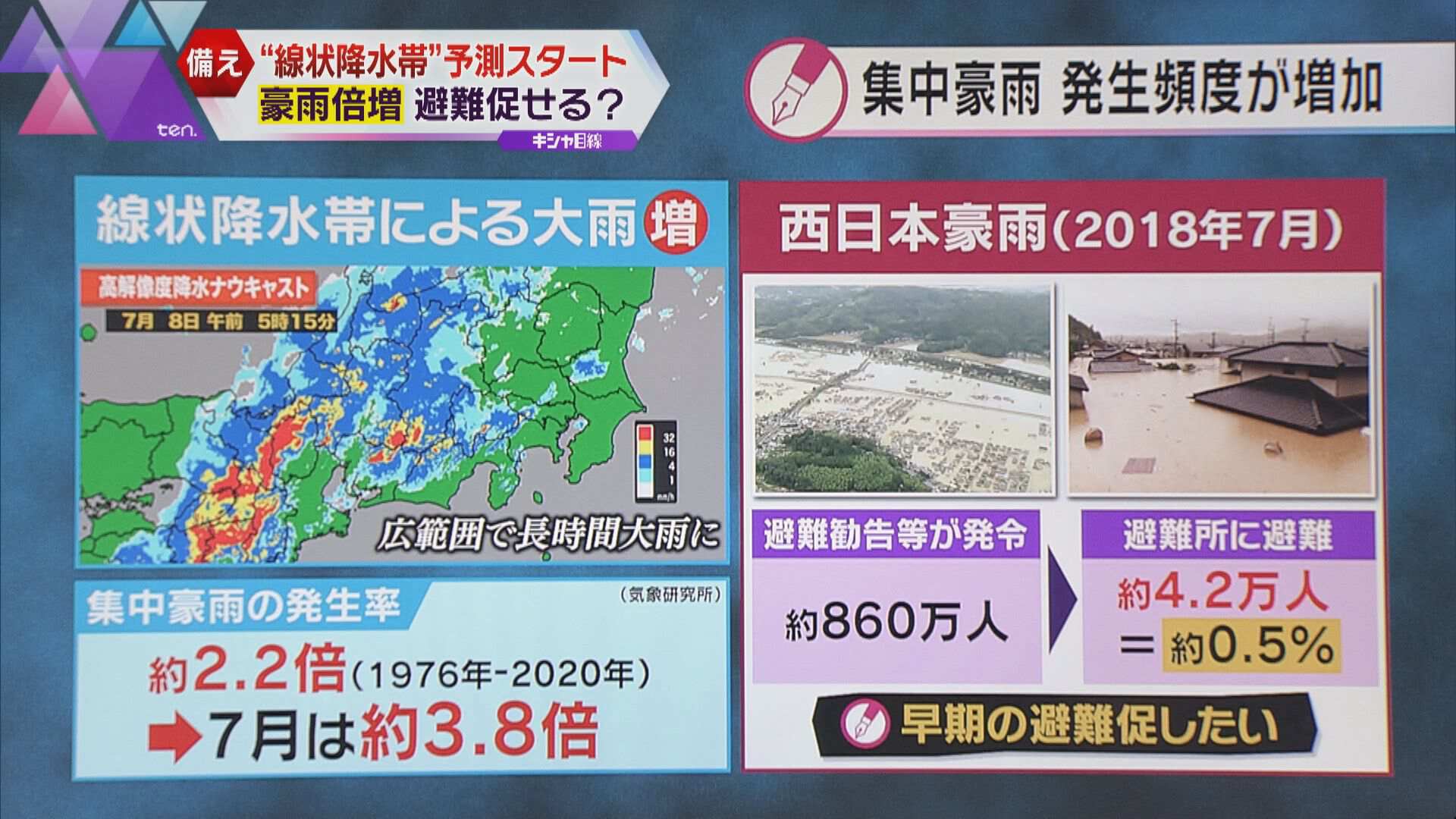 豪雨が身近になる中で大きな課題と言えるのが“逃げ遅れ”の発生です。2018年7月の西日本豪雨では、避難勧告が約860万人に出されましたが、実際に避難した人はその約0.5%にあたる約4.2万人しかいませんでした。気象庁は線状降水帯の予測を発表することで、早期の避難行動を促したいという狙いがあります。