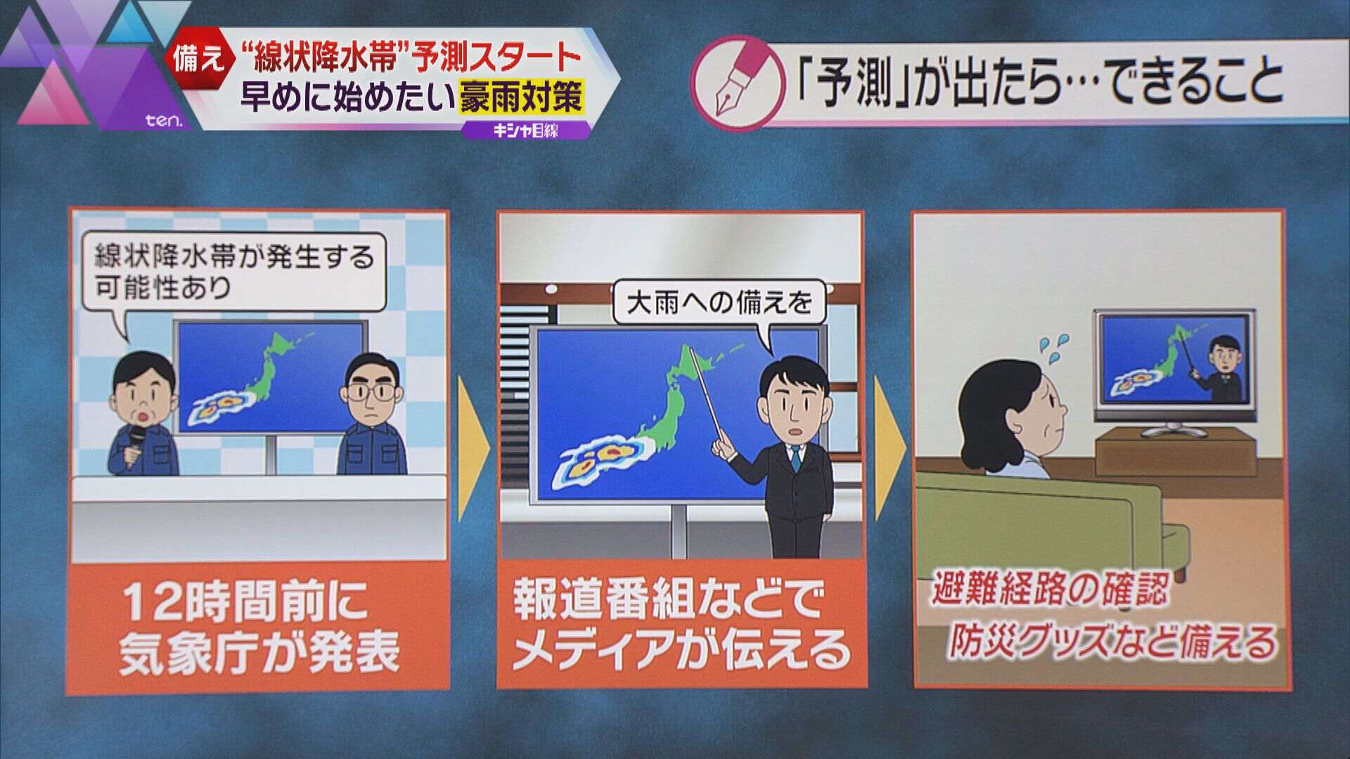 的中率はまだ低いのですが、大雨をもたらす線状降水帯の予測が12時間前にできる、というメリットもあります。予報が発表されたからと焦るのではなく、明るいうちから、大きな被害が多くなる夜までに備えることができることです。12時間前に気象庁が発表することで、報道番組などのメディアが情報を伝え、さらにそれを見た人が「避難経路の確認」や「防災グッズなどを備える」ということが可能になるのです。