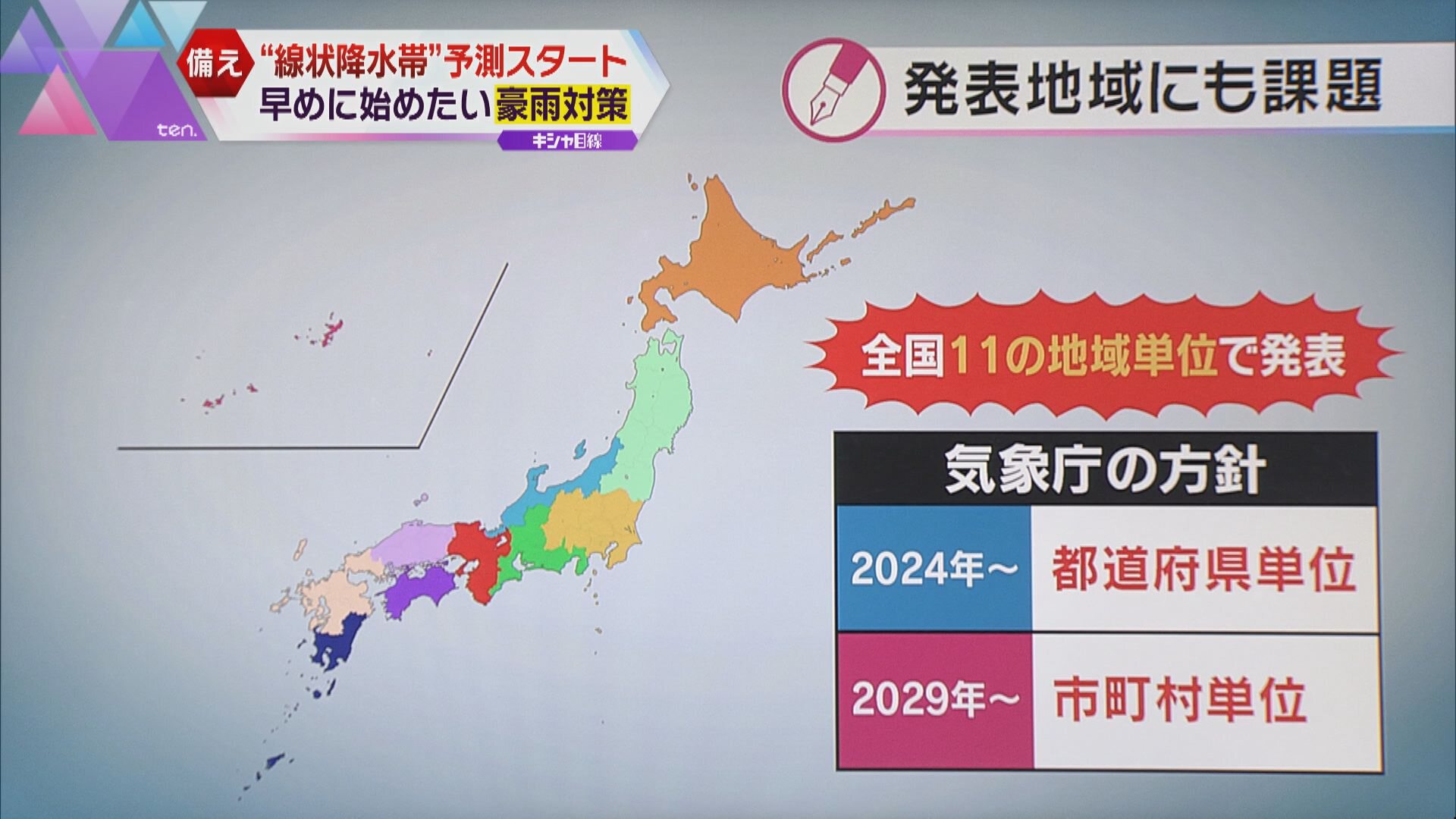 現在、線状降水帯予測は全国11の地域単位で発表されています。2024年からは都道府県単位に、2029年からは市町村単位での発表となり、精度はより高まっていくということです。しかし油断は禁物で、実際に線状降水帯が発生しているにもかかわらず、3回に2回は見逃してしまうケースもあるといいます。線状降水帯の予測が出ていないからといって油断せず、早めの避難や備えを心掛けてください。