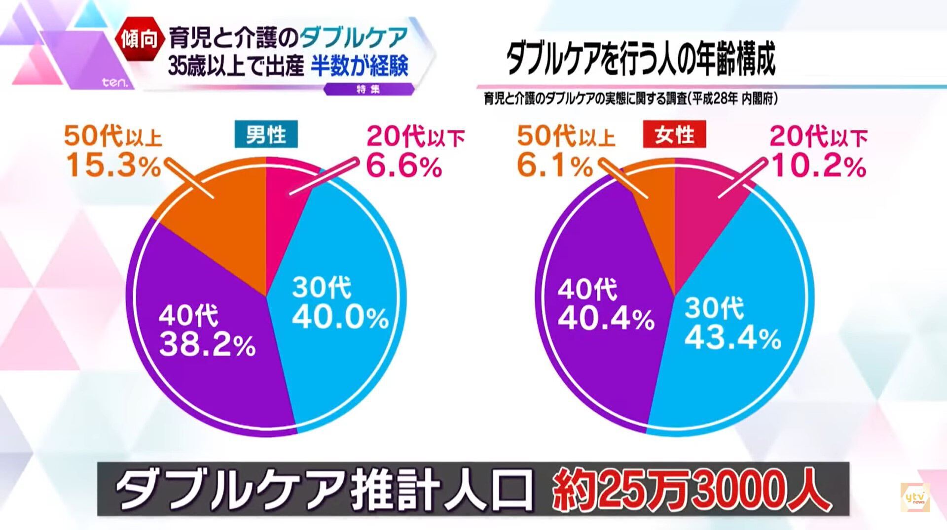 育児と介護を同時に担う「ダブルケア」。その人数は全国で約25万3000人とも言われ、このうち男女共に8割を、30代から40代の働き盛りの世代が占めています。35歳以上で妻が出産した男女のうち、約半数が育児と介護の両立を経験しているとの調査もあり、経験者のうち10人に1人はやむを得ず離職するなど、経済的な負担ものしかかります。