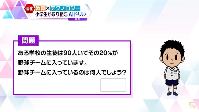 例えば「ある学校の生徒は90人いて、その20%が野球チームに入っています。野球チームに入っているのは何人でしょう?」という問題。これと同じような問題を繰り返し間違えると、AIが「この児童は、%を少数に直すのが苦手」と判断し、“%を少数に直す”ことに特化した問題が多く出題されるようになります。そうして児童たちの理解を引き出すのです。