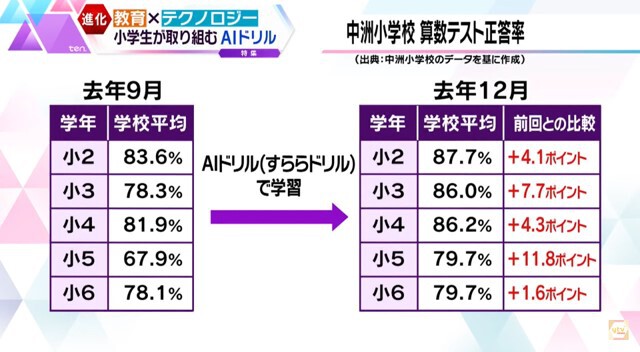 さらに、授業範囲や学年にとらわれず、自分に合わせた学習ができるメリットがあり、この学校では3か月間AIドリルに取り組んだ結果、同じ難易度のテストの正答率が、全ての学年で上がりました。