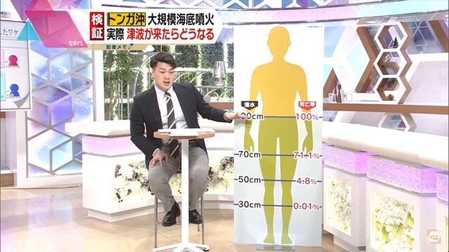 「身長170cmの人で、腰の高さくらいの100cmまで浸水したら、『死亡率100%』と言われています。膝くらいの50cmの高さでも、車などが押し流されるので、かなり危険なものとなります。実際の津波を再現した実験では、60cmの津波の水圧で、大人の男性が立っていられない状態になりました。」
