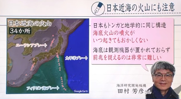 「日本とトンガは島国というだけではなく、『プレートの境目にある』というところも似ていて、海側のプレートが陸側のプレートに沈み込んでおり、非常にマグマがたまりやすいのです。海底火山の噴火がいつ起きてもおかしくない状態である一方で、海底には観測機器が置かれていないので、『前兆を捉えるのが非常に難しい』と専門家は言っています。」