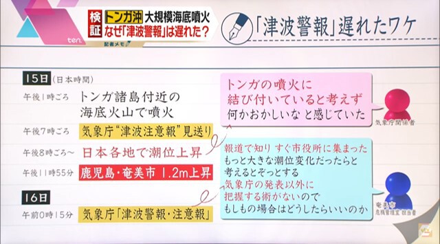 「最初に噴火したとき、気象庁は遠いということで“注意報”を見送ったのですが、その後潮位の上昇が確認されていきます。噴火の衝撃波が非常に大きく、その空気の振動で潮位の上昇が起きていたのですが、気象庁の担当者は、『何かおかしいな』というのは感じたらしいのですが、これが噴火に結び付いているものだとは考えていなかったそうです。」