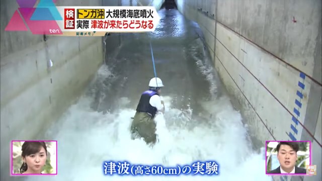 60cmの津波実験 水圧で男性が立っていられない状態に