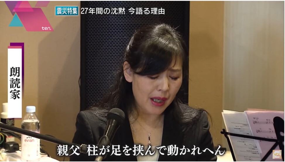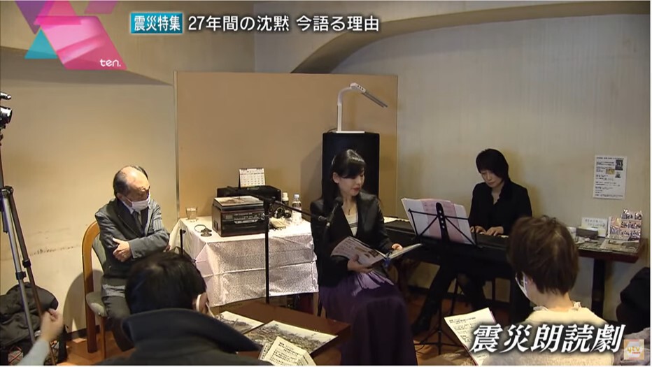 そして、1月13日に神戸市内で発表された朗読劇。タイトルは「生きながら燃えて」。生き埋めになった息子を助けられなかった父親のエピソードです。朗読する女性の声が響きます。