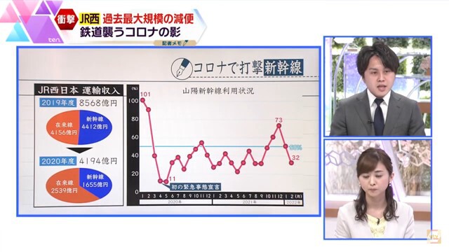 「今回、コロナ禍で運輸業界は苦しい状況にありますが、特にJR西日本は影響が大きいのは新幹線事業だと言っています。運輸収入全体ではコロナ禍前の2019年度から半減しており、その中でも新幹線事業は6割減と大きく落ち込んでいます。」