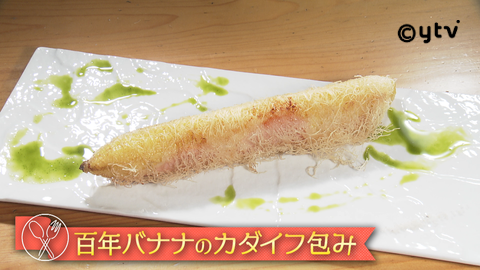 バナナの皮を剥いてカダイフで巻き繋ぎ目を下にして油で揚げる