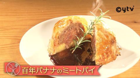 バナナの上に丸く成形した生のハンバーグをのせ上にパイ生地をのせる