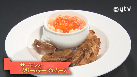⑥角切りのサーモンやイクラを添えて完成。バゲットに乗せて食べます