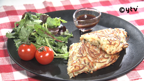 1.じゃがいもは皮をむいてスライサーまたは包丁で千切りにし、水にさらさずに軽く塩をふる。