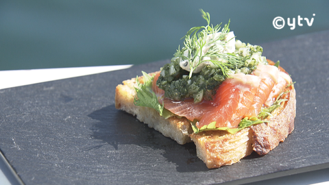 3.パンの上に大葉を乗せ、サーモンを盛り付ける。