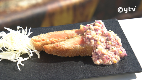 塩胡椒で味付けしたサーモンに小麦粉・卵・パン粉を付け、 フライパンで揚げずに焼き目をつける