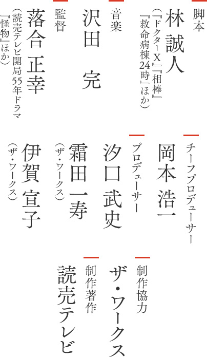 【脚本】林 誠人(『ドクターX』『相棒』『救命病棟24時』ほか)【監督】落合 正幸(読売テレビ開局55年ドラマ『怪物』ほか)【チーフプロデューサー】岡本 浩一【プロデューサー】汐口 武史・霜田 一寿(ザ・ワークス)・伊賀 宣子(ザ・ワークス)【制作協力】ザ・ワークス【制作著作】読売テレビ
