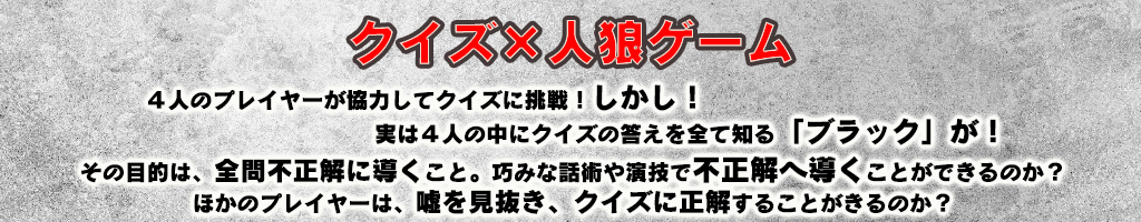 つまり、この番組はクイズと共に進行する人狼ゲームなのだ!ブラックは巧みな話術や演技で他のプレイヤーにバレずに不正解へ導くことができるのか?ブラック以外のプレイヤーは嘘を見抜き、クイズに正解することがきるか?
