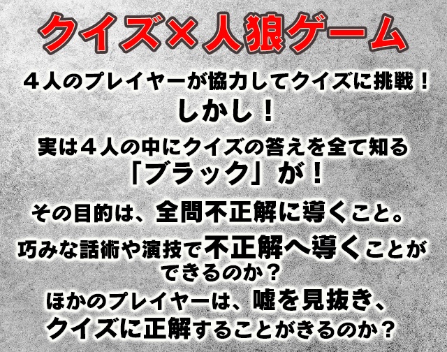 しかし!実は4人の中にはクイズの答えを全て知っている「ブラック」が紛れ込んでいる。ブラックの目的は全問不正解に導くこと。