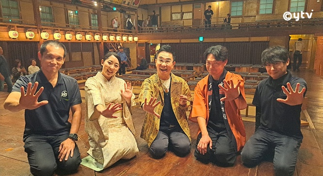 八嶋は昨年から豊岡市での「豊岡演劇祭」に参加している。出石にある歴史ある芝居小屋「出石永楽館」を訪ねることも今回の旅の目的だと話す。そして「出石永楽館」へ行くと入り口には大ヒット中の映画「国宝」のパネルが。同館は「国宝」の撮影に使用され、いま人気爆発中なのだ。館長の赤浦毅さんが「ここは舞台にあがるのも自由です」と話す。八嶋も映画の登場人物になりきって舞台を歩き――?!