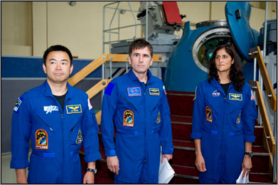 7月15日の打上げ予定まで、いよいよあと1週間!このトリオで国際宇宙ステーションを目指します。NASA、ロシア、そしてJAXAと所属宇宙機関は異なるけど、おそろいのロゴマークのパッチを付けて、さあ宇宙へ!でも、その前にまだまだ試験が・・・。これは、ガガーリン宇宙飛行士訓練センターでソユーズ宇宙船の手動操縦に関する試験に臨むところ。一致団結して頑張るぞ。