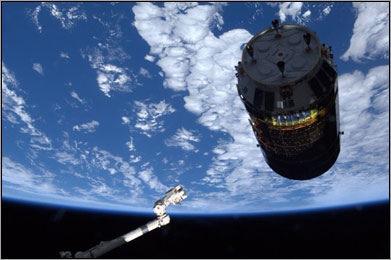 日本の技術と誇りが詰まった「こうのとり」が僕達の大事な物や実験装置を積んで、種子島から宇宙ステーションにやってきました。これは、その到着直前の「こうのとり」。仲間のNASA飛行士と一緒に捕まえるから、早くおいで!